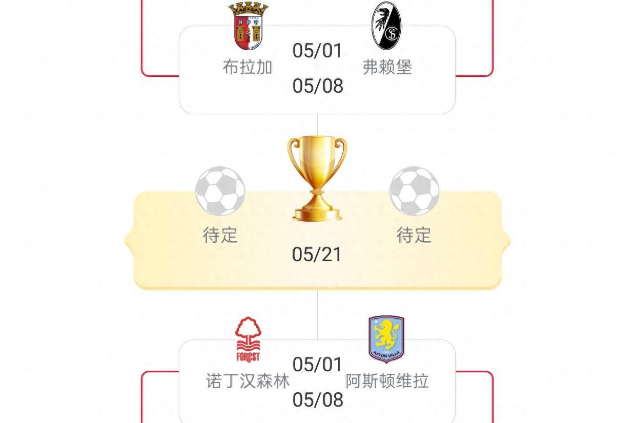 欧联四强:布拉加(淘汰贝蒂斯)、弗莱堡(淘汰塞尔塔)、诺丁汉森林(淘汰波尔图)、阿斯顿维拉(淘汰博洛尼亚);欧联半决赛将迎来英超内战,诺丁汉森林vs阿斯顿维拉,这意味着至少有一支英超球队可以晋级本赛季的欧冠决赛。